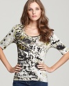Featherweight stretch jersey updated with a colorblocked shoulder yoke and gathered swing back.