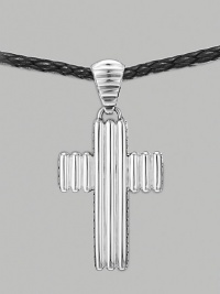 A ridged cross pendant crafted in polished silver hangs from a woven cord of soft leather.