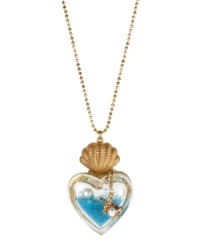 Betsey Johnson has sent you a message in a bottle! This fabulous long necklace features a captivating heart bottle pendant with glass pearls, pink and blue faceted beads and a turtle at the inside. A gold tone seashell sits at the top, and a crab charm with glass pearl accent dangles at the side. Crafted in antique gold tone mixed metal. Approximate length: 32 inches + 3-inch extender. Approximate drop length: 2-3/4 inches. Approximate drop width: 1-3/4 inches.