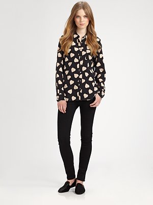 Darling heart print and a classic shirttail hem enliven this lightweight silk staple.