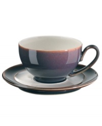 A true gem, the Amethyst wide-rimmed saucer is simply glazed but boldly hued, in deep indigo and crisp white from Denby's collection of dinnerware. The dishes can embrace their luxe color alone or they can be paired with the playful dots of Amethyst Stone for a well-balanced and uniquely customized table setting.