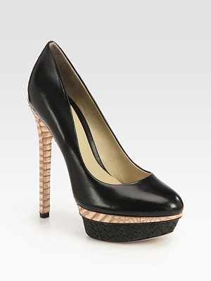 A textured raffia platform takes this leather pump with metallic snake-print accents to new style heights.