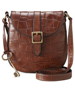 Give in to your animal instincts with this croc-embossed leather bag from Fossil, featuring brasstone hardware and signature detailing. Convenient crossbody strap keeps hands free for easy access to pockets and compartments within.