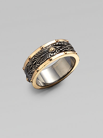 A stunning two-tone ring featuring an outer band plated in luscious rose gold and a spinning interior band of intricately designed blackened sterling silver.