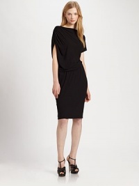 A sleek jersey dress with curve-hugging appeal. One shoulder features stylish ruching for a unique, asymmetrical look.