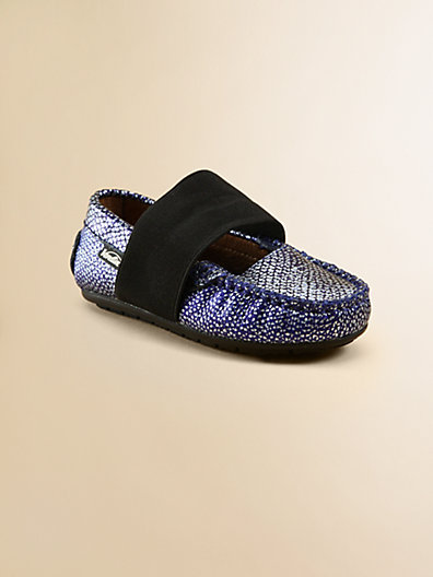 Metallic flecks lend a celestial touch to these cozy moccasins in plush leather with a thick elastic strap for a perfect fit.