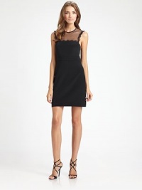 This sleek design features a sheer lace yoke, secured in back with a ribbon tie.