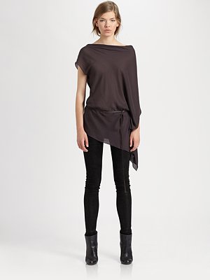 Finished with a detachable leather belt, this semi-sheer boatneck has a single cape sleeve, single short sleeve and an asymmetrical hem.