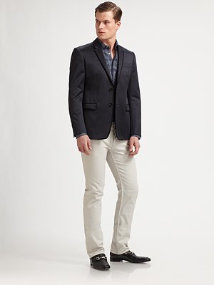 Slim lapels and piping characterizes this signature wardrobing essential, handsomely tailored in rich Italian cotton.