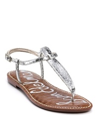 Look fabulous poolside in these metallic snake printed t-strap sandals.