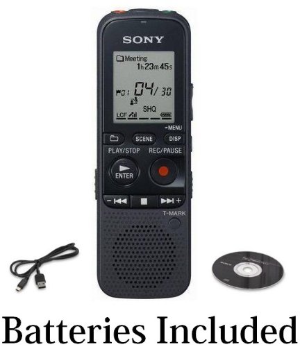 The voice recorder comes with a built-in 2GB flash memory providing 530 hours of recording time. The Memory Card slot offers access to recording additional time using optional flash memory media that can be removed and stored or used to transfer recordings to a computerThe PC-link (USB) allows you to connect the voice recorder to your computer for easy editing or recordings. You can also play back recordings on your PC, share them by email, or organize them an record them to a CDDragon Compatible / Certified: The recording quality of the unit has been optimized and validated by Nuance to work with the Voice to Print Dragon NaturallySpeaking software (sold sep.)Track Mark: Finding an exact spot in your recording is now easier than ever before. Place up to 98 track marks in each recorded file which can be "jumped" to for playback.Voice Operated Recording: starts and stops the recording when sound of a sufficient level is picked up by the microphone. This feature saves valuable recording time by not recording periods when there is little or no sound. The following items are included Two "AAA" batterers, Operating Instructions, USB connecting cable and Application Software, Sound Organizer (CD-ROM)