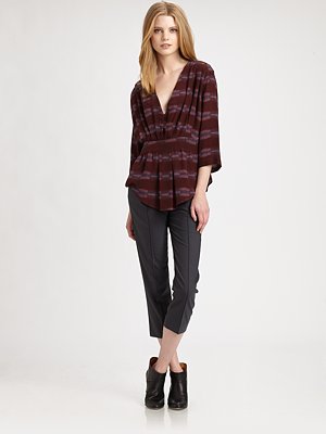 Pure silk in a painterly stripe print with a plunging v-neck, three-quarter sleeves and allover pleating.