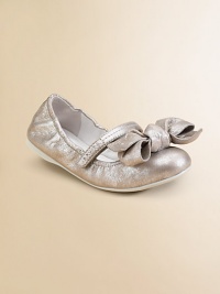 Metallic leather ballet flats with an adjustable grip-tape strap, a sweet bow and logo.