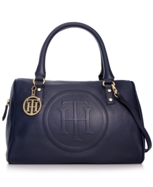 Preppy, posh and poised to meet your daily demands, this signature leather satchel from Tommy Hilfiger is the perfect piece. Logo-embossed with gleaming hardware, the spacious design stows everything from eReader to opera tickets.